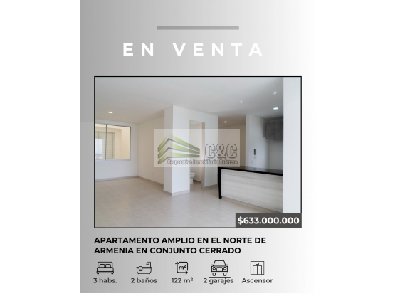 Amplio apartamento ubicado en la zona norte de Armenia , cuenta con un diseño moderno y acabados de alta calidad. Este apartamento de 122 m² cuenta con sala y comedor independientes que reciben abundante luz natural, un balcón con vista panorámica, cocina integral abierta con barra tipo americana y zona de lavandería independiente.