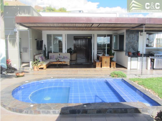 La casa cuenta con los siguientes espacios: 2 parqueaderos Cubiertos, Cocina, Zona ropas, Sala, comedor, alcoba Servicio, 2 habitaciones con baño compartido, Alcoba principal con baño y vestier, Sala de Tv, Terraza, Zona húmeda jacuzzi.